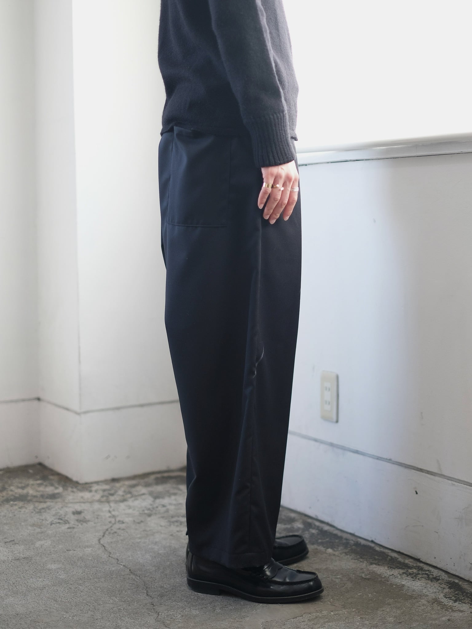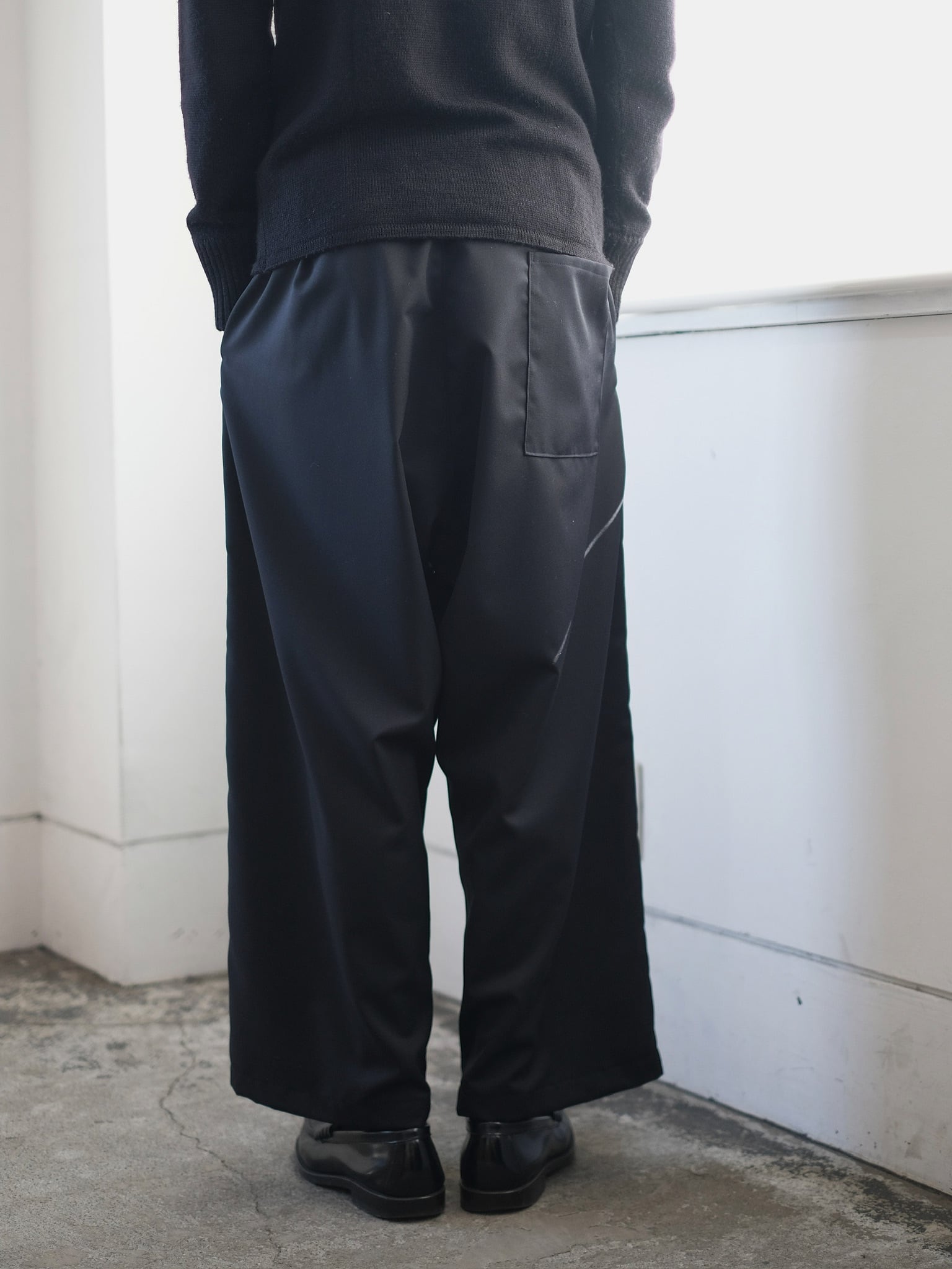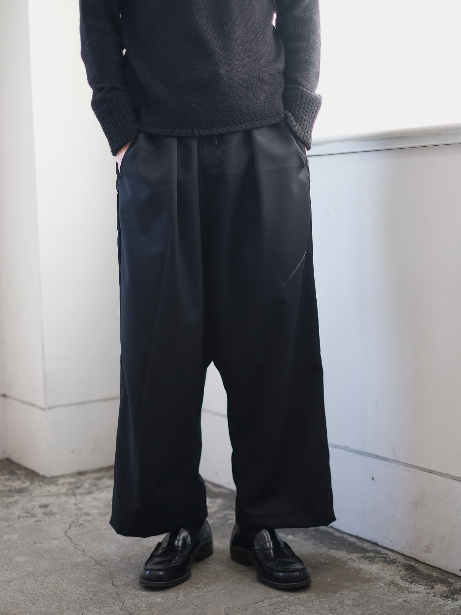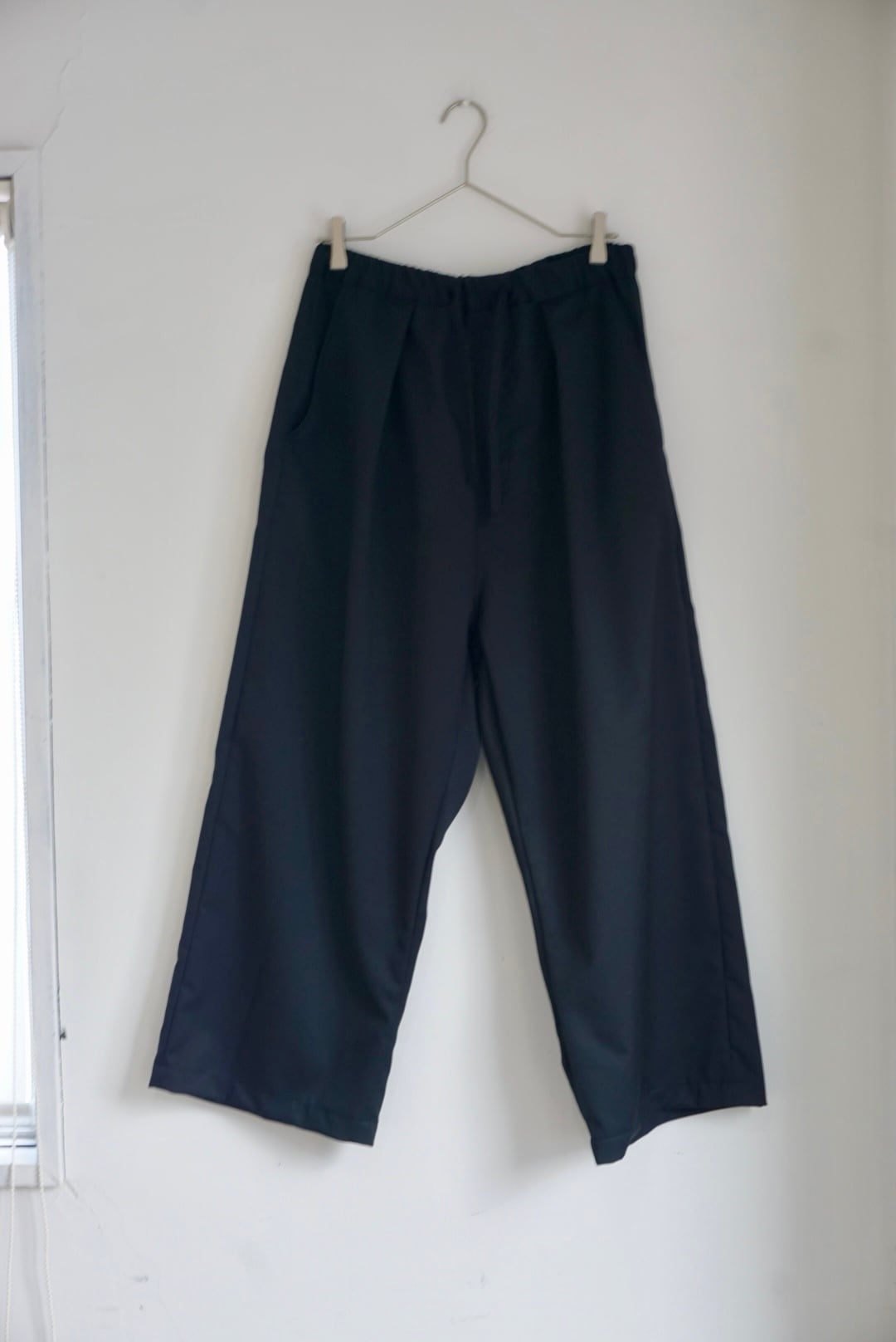 -size (cm)- ウエスト 36-45(ゴム紐入り) 股上 41 股下 60 裾幅 29 モデル 178cm ‐素材‐ ウール